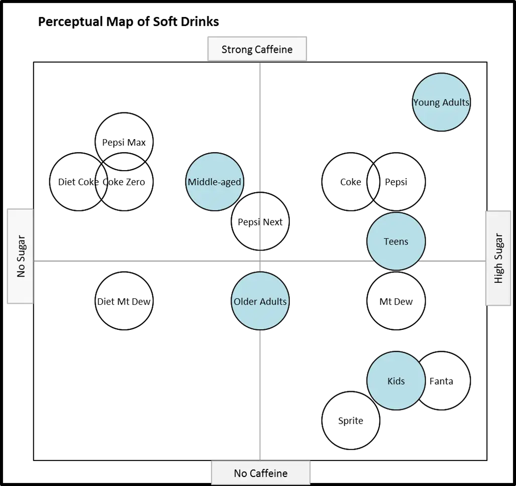 The Young Adults market segment is the only segment that sits in the top right-hand corner – a position which is often mistakenly considered to be the best place on the map. Therefore, this target market prefers to drink that has both strong caffeine for energy and high sugar for energy and taste. As you can see, in this perceptual map example, Pepsi followed by Coca-Cola has the most suitable positioning for success with this market segment.